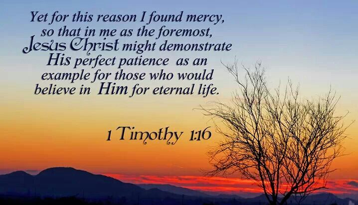 1 Timothy 1:16 (NASB): “Yet for this reason I found mercy, so that in me as the foremost, Jesus Christ might demonstrate His perfect patience as an example for those who would believe in Him for eternal life.”
